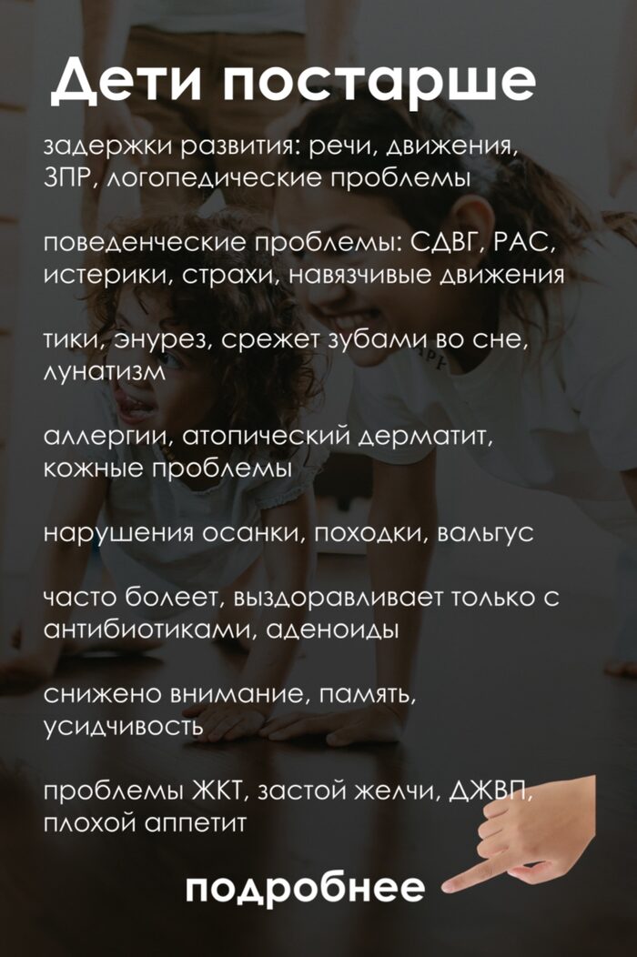 Отдельный симптом часто является лишь следствием скрытой дисфункции. Например, проблемы с речью могут быть связаны с родовой травмой, которую устранит остеопат, или дефицитом важных микроэлементов, который скорректирует педиатр-нутрициолог, а неусидчивость — с незрелостью определенных отделов мозга, коррекцией которой займется невролог или метод Томатис.